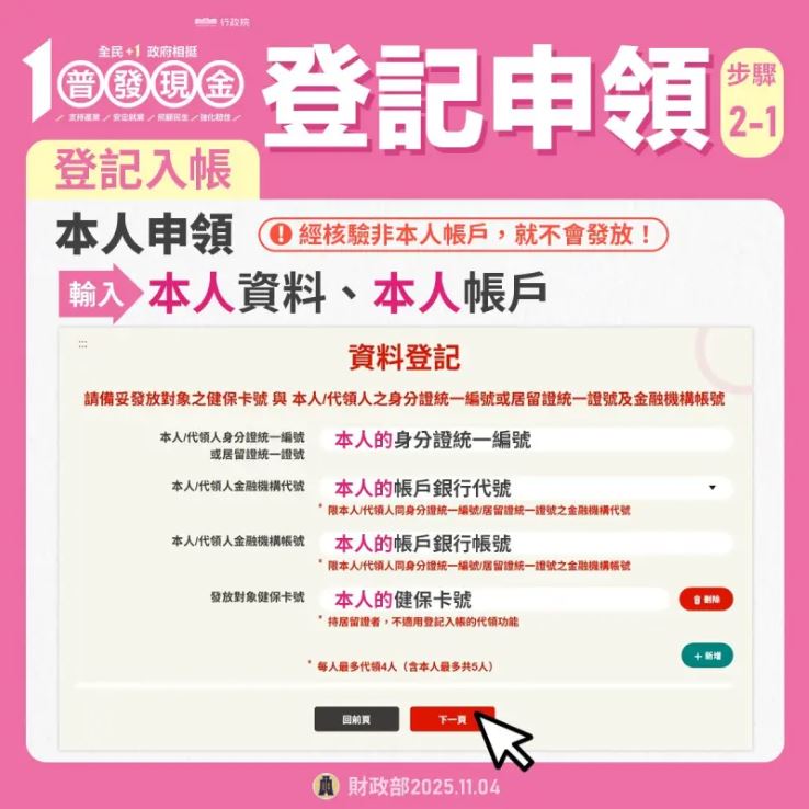 第2步:輸入資料,輸入本人或帶領人身分證或居留證號、金融機構帳號、發放對象健保卡號