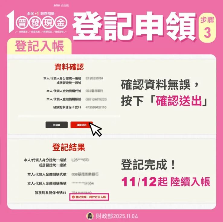 普發一萬登記入帳於11月5日開始,首日身分證尾數分流從「0、1」開始,11月6日尾數為「2、3」、11月7日尾數為「4、5」、11月8日尾數為「6、7」、11月9日尾數為「8、9」、11月10日後開放台中太平薪資免保人借款民眾登記,登記時間充裕將持續至115年4月30日止。