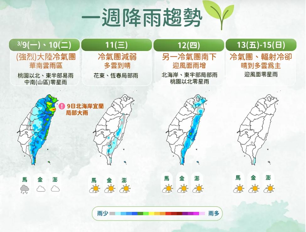 週三至週四上半天天氣晴朗氣溫升,上半天冷氣團減弱氣溫回升,東半部偶有局部短暫雨的機率。